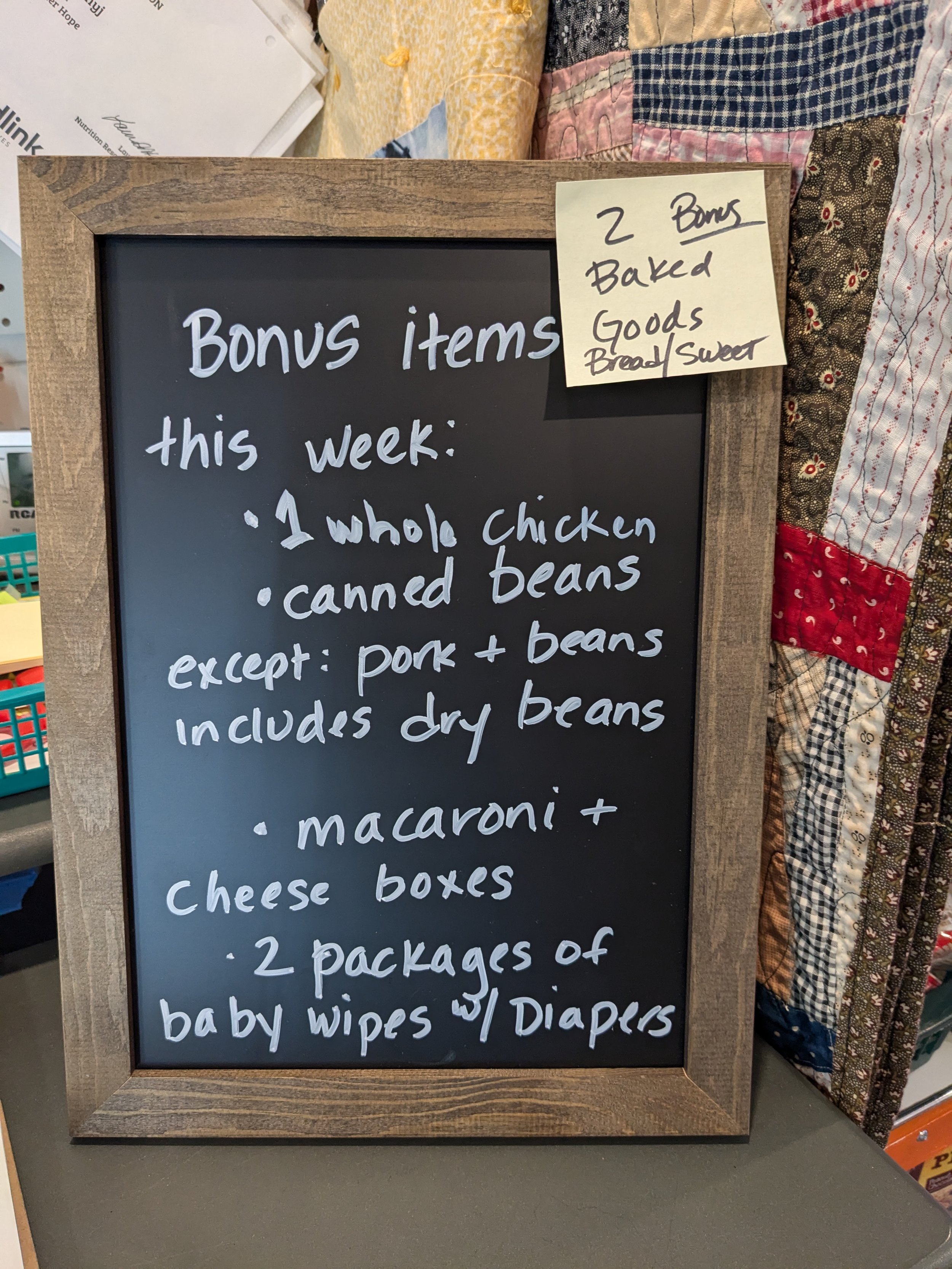 The extra allows us to do things such as provide bonus items, while they last, for many households on top of their usual allowances. A new “bonus board” lists the items; in a recent week it had such things as a whole chicken and extra diapers and baby wipes for those who need them.