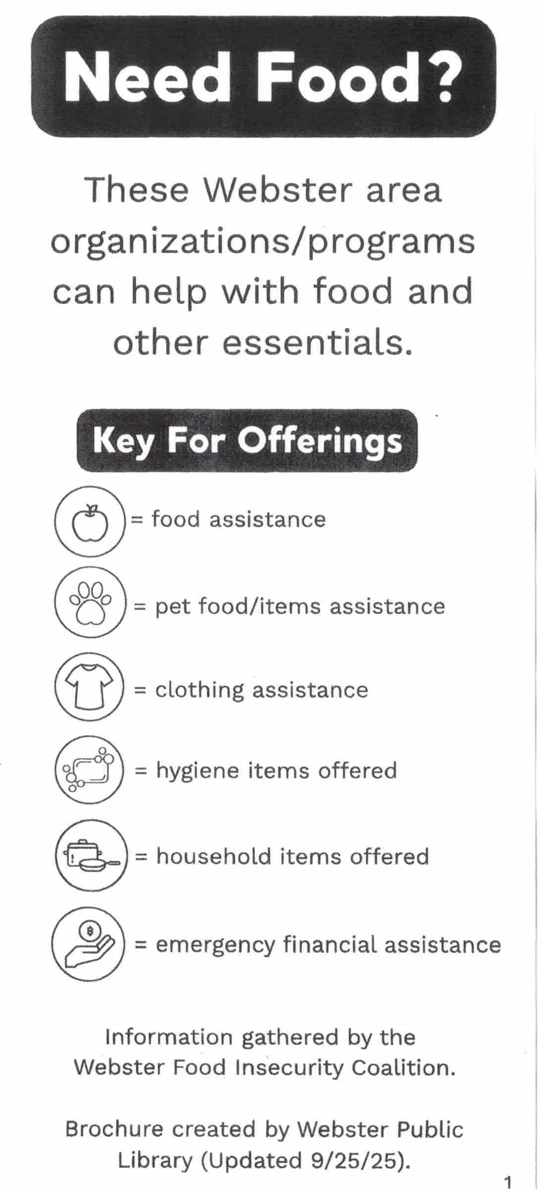 The Webster Food Insecurity Coalition, with more than a dozen member organizations, publishes a brochure listing nearly 20 locations for food assistance. Click on the image at the right to download a PDF brochure listing them.